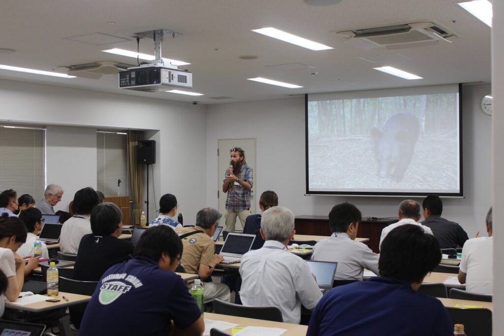 午前中は、四国自然史科学研究センターから四国におけるツキノワグマの現状について報告がありました。続いて、IUCN(国際自然保護連合)CPSG本部のサイモン氏より、今回のワークショップの目的や、個体群存続可能性分析(PVA)が果たす役割についてご説明いただきました。